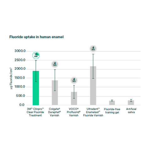 A diferencia de los barnices de flúor tradicionales que dependen de la saliva para descomponer la capa adhesiva a base de colofonía antes de liberar flúor, el tratamiento de flúor 3M™ Clinpro™ Clear utiliza una fórmula a base de agua que hace que los iones de flúor estén disponibles inmediatamente tras la aplicación. Con 2.1% de flúor de sodio, Clinpro™ Clear proporciona una absorción de flúor igual o mejor que los tratamientos tradicionales de barniz al 5%—a pesar de usar una concentración más baja de flúor—ofreciendo una opción de tratamiento más eficiente y amigable para el paciente1.