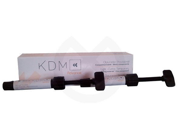 Fotocurable.Consistencia más dura.Color translúcido. Obturador provisional fotopolimerizable. Monocomponente para el sellado y obturación temporal. Su consistencia elástica garantiza una fácil adaptación y remoción incluso en obturaciones profundas muy retentivas. KDM Advance se presenta en jeringas de un sólo componente. Fotopolimerizable permanece elástico, incluso una vez fraguado. Su adaptabilidad a los márgenes de la obturación garantizan una impermeabilidad y sellado óptimos. La eliminación o extracción de advance es rápida, limpia y segura. KDM Advance es de color claro- traslúcido.