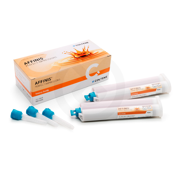 Las siliconas de impresión convencionales conducen a unos resultados insatisfactorios en condiciones clínicas de humedad debido una insuficiente fluidez y a una pobre afinidad con la superficie. El resultado es la aparición de poros por la incorporación de aire y distorsión marginal. Affinis es una silicona del tipo A pero con una afinidad a la superficie y unas propiedades ideales de viscosidad: - Su rápida y única afinidad con la estructura húmeda lo hace fluir como un hidrocoloide alcanzando las zonas más críticas sin tener que ejercer ningún tipo de presión con el material de cubeta. - La especial combinación de aditivos ejerce una mínima barrera a la viscosidad (consistencia auto-adaptante) evitando atrapar el aire pero a la vez el material es suficientemente tixotrópico para evitar el goteo fuera de la preparación.