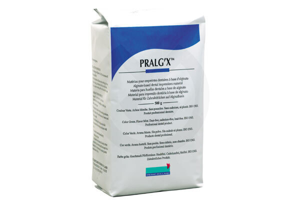 Fraguado normal. Verde. Mentolado.Tres alginatos adecuados a cada gusto y necesidad. Son alginatos de gran precisión y elevada resistencia al desgarro. Sin polvo, perfectamente ecológicos, no contienen plomo ni cadmio. Son de fácil manipulación, agradables en boca y garantizan confort y seguridad en cada toma. - PRALG´X: Alginato de muy buena elasticidad, color Verde y aromatizado a la menta. Tiempo de mezcla: 30 seg. Tiempo de trabajo: 50 segundos. Tiempo de toma en boca: 1 minuto.