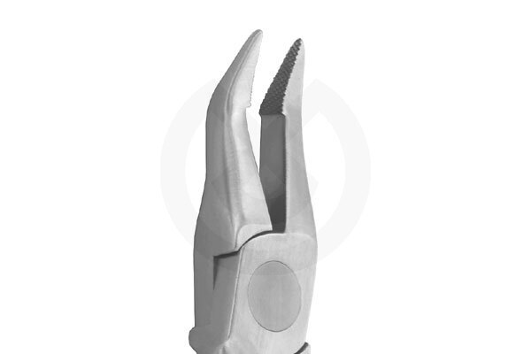 Mango 10 cm. Max. .030 (0,76 mm.). Alicate versátil con dientes. Cónico y con una angulación de 32º para colocar y extraer arcos de alambre.