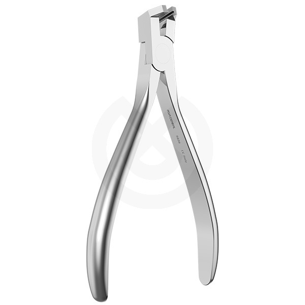 Alicate de corte distal, con sujeción del arco. Es un alicate diseñado para cortar arcos dentro de la boca del paciente. Puede cortar arcos gruesos y sujeta el extremo distal para prevenir daños en los tejidos blandos. Capacidad máxima de corte rectangular 0,56 x 0,7 (022” x .028”), arcos redondos hasta 0,5 mm (.020”).