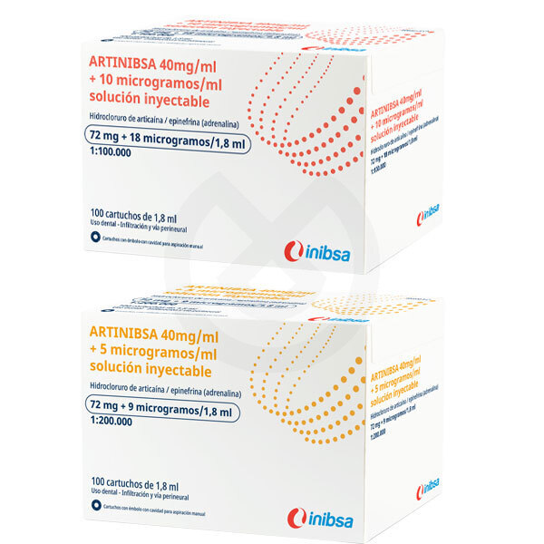 Artinibsa 40 mg/ml + 0,01 mg/ml o 40 mg/ml + 0,005 mg/ml solución inyectable. Anestésico local potente con articaína y epinefrina con tiempo de latencia corto. Su elevada liposolubilidad le confiere una mejor difusión a través de los tejidos blandos y óseos resultando muy efectivo en técnicas infiltrativas.