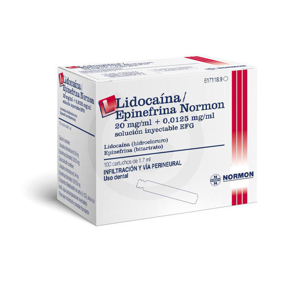 Lidocaína al 2% con epinefrina en solución inyectable. Envase con 100 cartuchos de 1,8 ml.