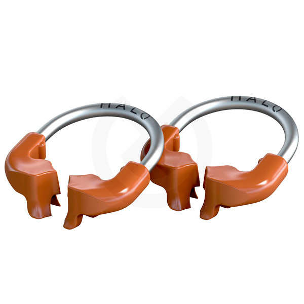 Los anillos Halo incorporan dientes de nailon rellenos de fibra de vidrio que los hacen rígidos y fuertes. Estos anillos son de nitinol superelástico que mantiene su fuerza y longevidad. Los anillos de Halo están anatómicamente contorneados para ser suaves con los tejidos blandos, ayudan a reducir el brillo, aseguran una forma natural y mantienen la integridad y la forma de la banda de la matriz. Son apilables, lo que permite su uso con MOD y otras restauraciones de Clase II, y brindan suficiente separación para las restauraciones adyacentes según sea necesario.