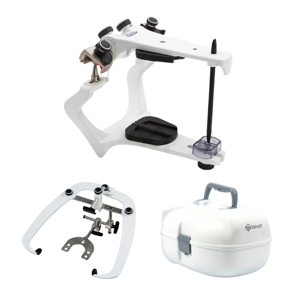 Pack completo para montaje de modelos y ajuste oclusal. Incluye articulador semiajustable tipo arcón, arco facial estándar para transferir la posición del maxilar superior al articulador y estuche para protección y transporte.