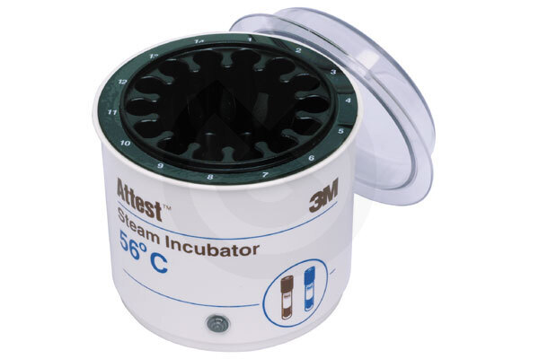 Los Controles Biológícos son cultivos de microorganismos no patógenos en forma de esporas que ofrecen gran resistencia a los agentes esterilizantes. Es el úníco sistema fiable que nos asegura la destrucción total de los microorganismos. La American Hospital Association (AHA) recomienda el uso de un control biológico una vez al día por esterilizador. Attest es un indicador biológico ideado para sustituir cualquier sistema de control biológico de esterilización empleado en Laboratorios, Centros Clínicos y Sanitarios. La principal diferencia entre Attest y las técnicas tradicionales, es que los resultados se interpretan por un simple cambio de color en el medio de cultivo, en lugar de por identificación de los organismos que han crecido en dicho medio. Los indicadores Attest contienen un reactivo (ácido-base) que cambia de color según el pH del medio de cultivo. Los microorganismos contenidos en Attest originan productos de desecho de carácter ácido que modifican el pH del medio, el cual se acidifica cambiando su color original al amarillo. Una vez finalizada la esterilización el Attest que se ha introducido con el material a esterilizar se incuba a 56ºC una vez activado. Pasadas 48 horas sin cambio de color la esterilización se considera correcta. Incubadora Attest: Válida para incubar el indicador biológico Attest. La incubación se efectúa por calor seco. Posee una placa calefactora donde se colocan los indicadores que incuba por contacto directo a los mencionados grados.