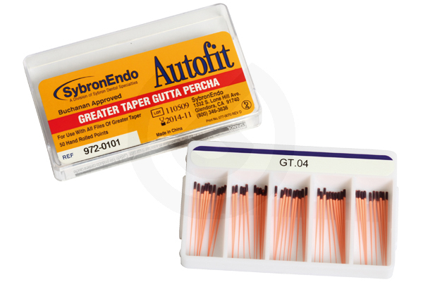 La gutapercha radiopaca de SybronEndo para la obturación para los canales radiculares. Los conos de gutapercha Autofit han sido diseñados para obturar canales conformados con limas de mayores conicidades.