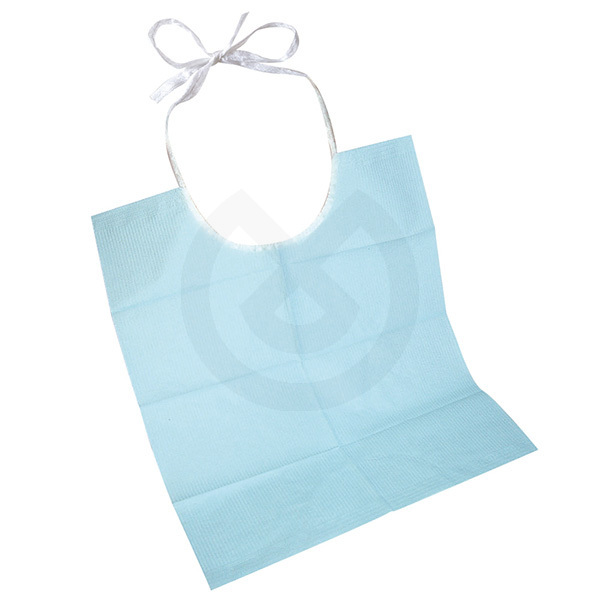 Baberos de color azul con cintas, para una excelente protección de la ropa del paciente. Compuesto de 3 capas: 1 capa de polietileno impermeable y 2 capas de celulosa. Dimensiones aprox. 45 cm x 40 cm.