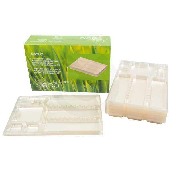 Bandeja desechable en PLA o ácido poliláctico, un polímero de origen vegetal (derivado del almidón de maíz) totalmente biodegradable: 90% en 60 días y completamente en 90 días.