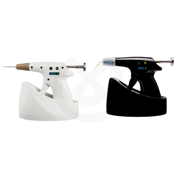 La pistola inalámbrica Beta Mini de B&L incorpora agujas giratorias de 360º así como una buena ergonomía para una mayor comodidad del dentista. Distribuye el peso para una mayor facilidad de uso y reduce la fatiga en la mano y la muñeca gracias a su cuidadoso diseño. Incluye una medida de seguridad adicional para evitar quemaduras mediante una tapa protectora que protege al dentista de quemaduras accidentales de la aguja caliente o la gutapercha. La batería del Beta Mini dura más de 4 horas de uso continuo con una sola carga, que equivale a una semana de tratamiento endodóntico. Instrucciones de uso de la pieza SuperEndo Beta de B&L mediante la técnica de inyección de gutapercha o resilon: - Introducir el pellet de gutapercha o resilon en la ranura superior de la pistola, retirando previamente el émbolo. - Acoplar la aguja del tamaño adecuado, precurvarla y colocar el protector termal. - Seleccionar la temperatura de la pistola Beta pulsando el botón H. En el caso de utilizar gutapercha se debe elegir 200 ºC. Si se usa resilon, seleccionar 150 ºC. - Esperar 45 segundos para lograr la temperatura deseada. - Introducir el extremo de la aguja dentro del conducto hasta hacer tope y activar la pieza con la mano. - El material fluirá empujando la pieza de mano fuera del conducto. - Al final de la obturación, limpiar la unidad con el cepillo de limpieza y alcohol.