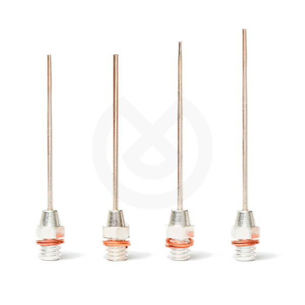 Disponibilidad de varios tamaños de puntas de plata en función de las necesidades del odontólogo: calibre 23 para una longitud de aguja de 21 mm; calibres 20 y 25 para una longitud de aguja de 22 mm; calibres 20, 23 y 25 para una longitud de aguja de 24 mm.
