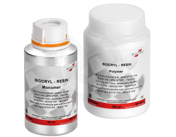 Resina autopolimerizable de aplicación especial en ortodoncia para la polimerización y recubrimiento de extremos de ganchos y tornillos de expansión al confeccionar placas de expansión y retenedoras con BIOCRYL® C mediante la técnica de termomoldeo a presión. La polimerización tiene lugar durante la fase de enfriamiento en el aparato de termomoldeo a presión. Ya no resulta necesario el largo método convencional de la polimerización en la olla a presión.
