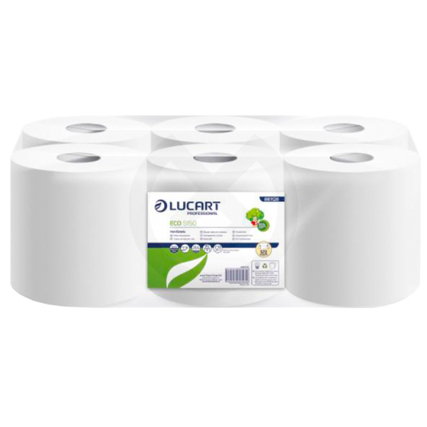 Bobinas secamanos de color blanco y 2 capas, fabricadas a partir de fibra 100% reciclada, suave y resistente. 572 servicios cada uno. 18,7 cm x 25cm de ancho. Diámetro del rollo 20 cm. Mandril extraíble tipo mecha.