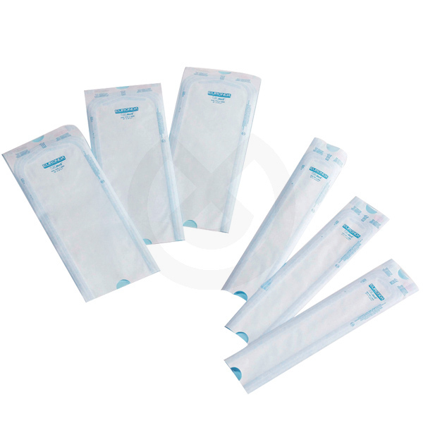 Bolsas que se pueden sellar de papel médico blanco de alto gramaje (60g/m2) y doble capa de película celeste de poliestereno/ polipropileno. Tres soldaduras laterales de canales impermeables y homogéneos para la máxima protección micróbica. Dotadas de indicadores químicos de viraje para esterilizaciones de calor o de EtO gas (óxido de etileno).