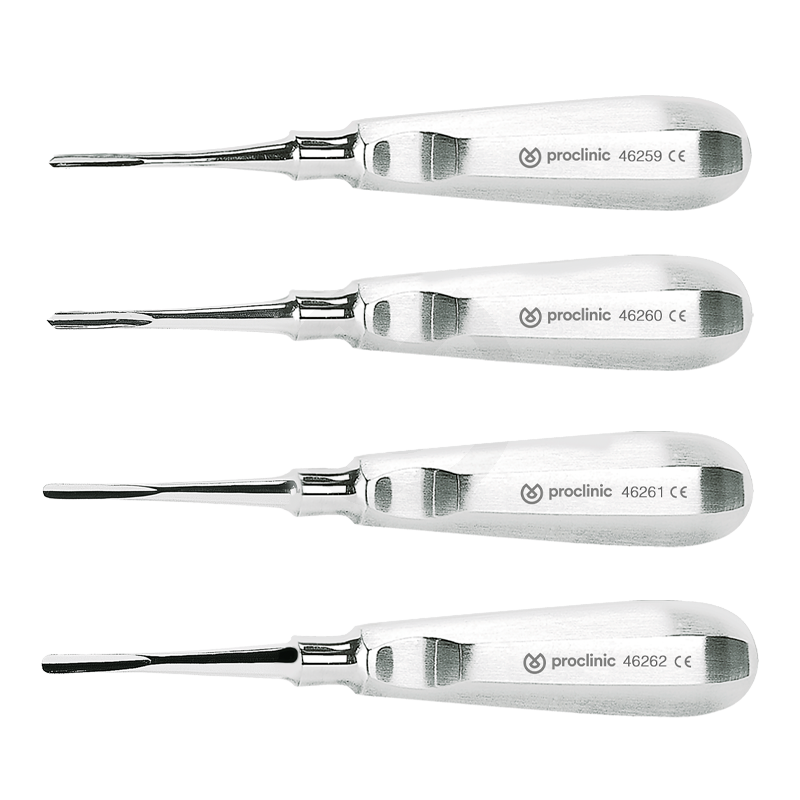 Botadores con mango tipo Bein específicos para la remoción y posterior extracción de dientes, fragmentos y raíces. Estos elevadores ejercen la función de leva y palanca. Ancho de la punta: Ref. 46259: 3 mm. (puntiagudo) Ref. 46260: 4 mm. (puntiagudo) Ref. 46261: 3,2 mm. (redondeado) Ref. 46262: 3,8 mm. (redondeado)
