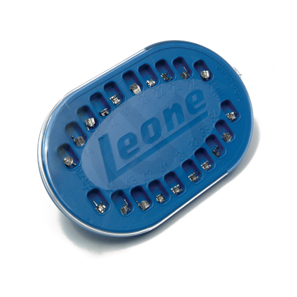 Los brackets de metal estándar están soldados con una especial aleación a base de paladio sobre malla 80 mesh sinterizada, para asegurar una fuerte adhesión al cliente con cualquier tipo de composite. Las bases están contomeadas anatómicamente para adaptarse perfectamente a la anatomía de cada pieza. Los brackets con gancho son obtenidos con tecnología MIM (Metal Injection Moulding). Todos los brackets Leone se suministran en envases ergonómicos.
