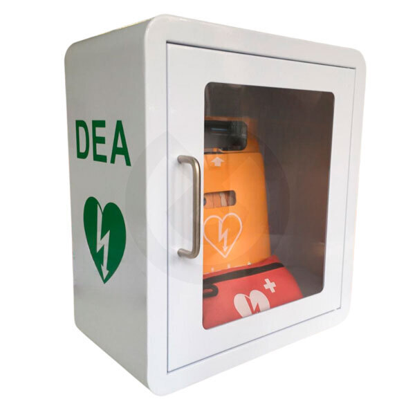 Cabina metalica blanca con Alarma para Desfibriladores.