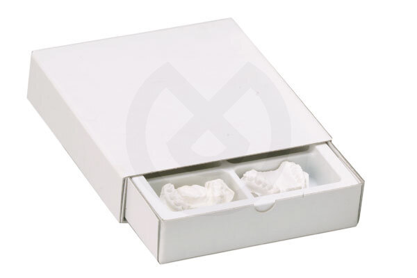 Para modelos de 6 arcadas. En cartón blanco macizo de alta resistencia. Incluye cubeta interior de plástico con seis departamentos y espacio para archivo de la hoja clínica, teleradiografía y cefalograma. Largo 24 cm. Ancho 23 cm. Alto 5,8 cm.