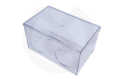 Construida en plástico inyectado transparente. Evita pérdidas de polvo de los metales presiosos. Evita los accidentes oculares por salto de partículas. Disminuye considerablemente la inhalación de polvos nocivos. Dimensiones: Ancho 230 mm. Largo 360 mm. Alto 210 mm.