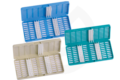 En plástico con 3 soportes de silicona para sujetar los instrumentos.Cajas en plástico para la esterilización de instrumentos en autoclave. Permiten lavar y desinfectar los instrumentos sin riesgo y llevarlos en la misma caja al autoclave. Las cajas tienen 3 soportes de silicona para retener con seguridad los instrumentos. Medidas L 18,8 cm x W 9 cm x H 5 cm.