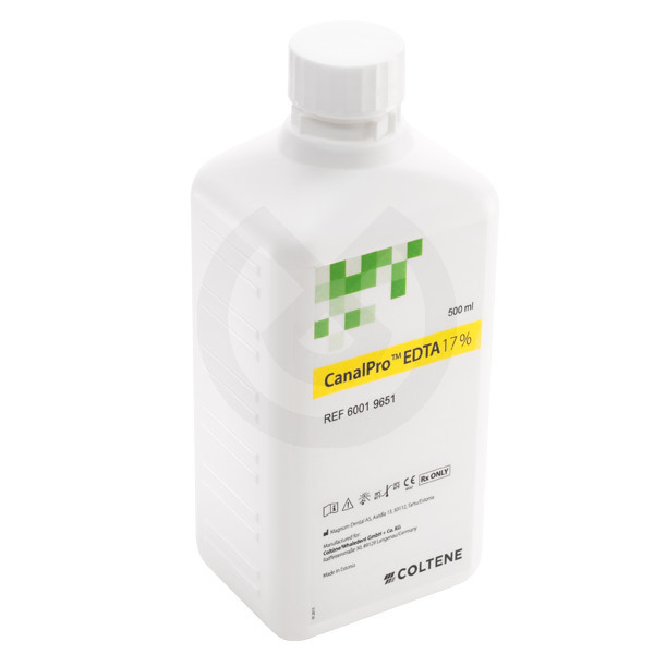 Líquido de irrigación EDTA al 17% (pH 8.5) de color transparente. Elimina el barrillo dentinario y abre los túbulos dentinarios para una mejor y más profunda desinfección y mejor adhesión del sellador y de los materiales de obturación.