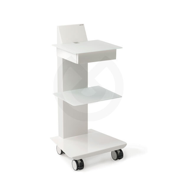 Carrito móvil portaaparatos con ruedas y frenos Material: metal electrozincado, acabado de pintura Medidas: 46 x 40 x 92 cm 2 Estantes en metal Cajón de almacenamiento Alimentación y 2 enchufes Schuko