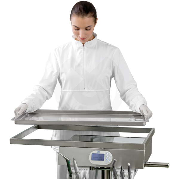 El carro Maycart pone a disposición toda la instrumentación necesaria integrada en una mesa de mayo de altura ajustable. Se trata de un único elemento de doble función que favorece todos los movimientos necesarios.