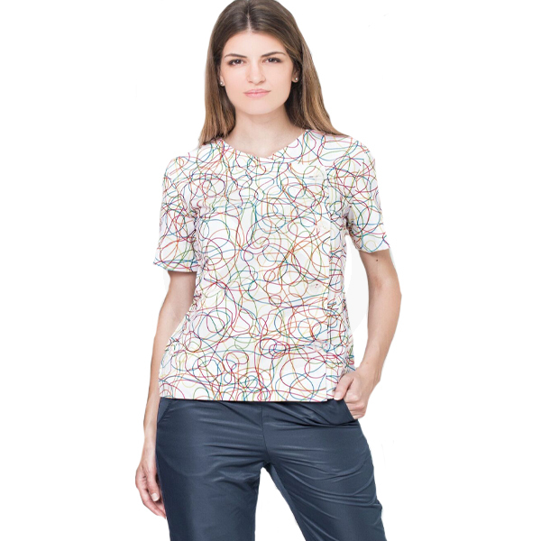 Casaca de cuello redondo y manga corta rematados ambos con bieses de 5 cm. con pespunte de adorno y tres bolsillos que cubren la parte delantera para hacerlo funcional y practico.