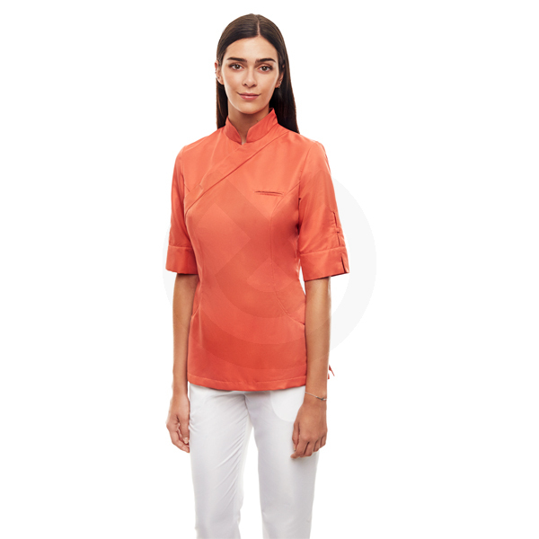 Casaca con frente cruzado, cremallera en costado y automáticos ocultos, elegante y cómoda,