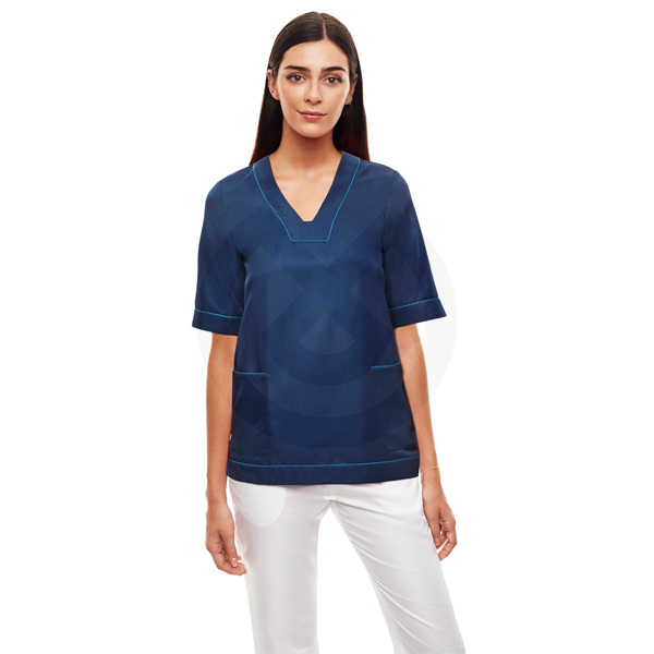 Casaca discreta y elegante con escote en V, manga sobre codo y dos bolsillos de plastón.