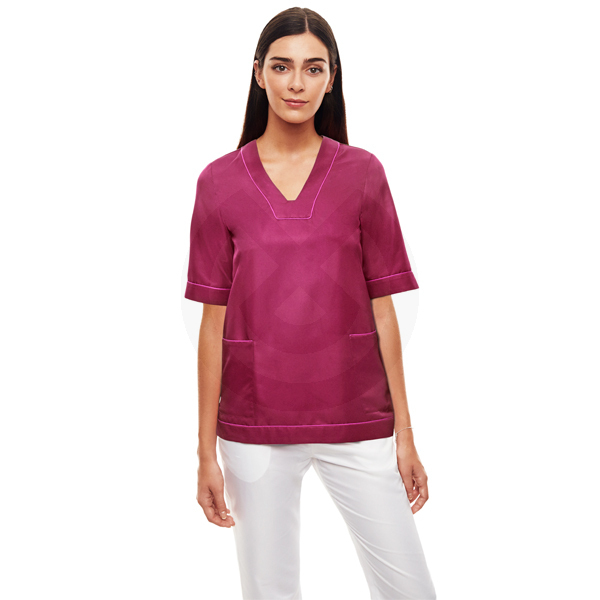 Casaca discreta y elegante con escote en V, manga sobre codo y dos bolsillos de plastón.