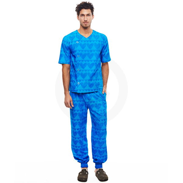 Casaca cómoda y funcional, corte masculino, recta de escote pico curvado y cruzada con manga corta. Pespuntes de adorno. Los bolsillos de vivo con pespuntes en contorno. Estampado muy divertido, trasmite felicidad y alegría.