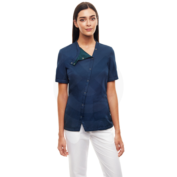 Casaca con cuello mao y botonadura diagonal con remaches metálicos que permiten ampliar la apertura del cuello cuanto se desee. Forro en contraste según color elegido.