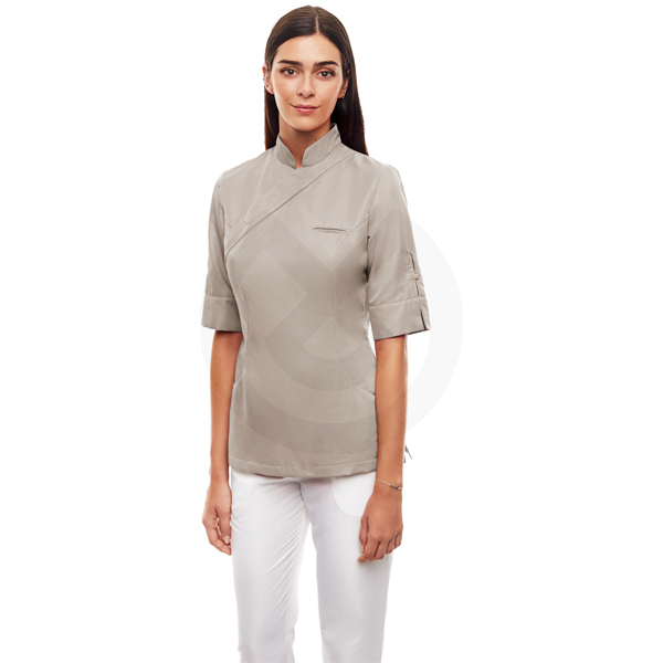 Casaca con frente cruzado, cremallera en costado y automáticos ocultos, elegante y cómoda,