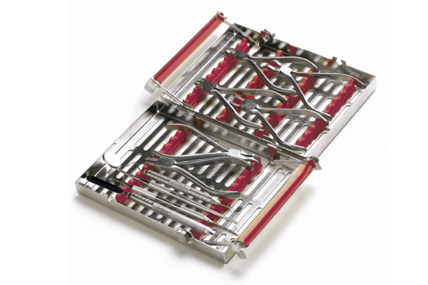 Con dos bandejas que al cerrar queda una encima de la otra. Dispone de espacio para 6 alicates, 1 Pinza Mathieu y 3 instrumentos tipo guía. Viene con banda de color a elegir. Dimensiones en posición cerrada: 152mm x 203mm x 38mm. Disponible también con bandas en otros colores (gris / blanco / naranja / amarillo / morado) bajo pedido especial.