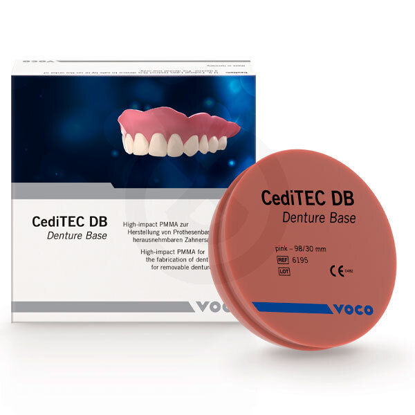 CediTEC DB Denture base es un disco de PMMA de alto impacto para la producción de bases protésicas para dentaduras removibles de alta resistencia para un largo uso. Muy buen pulido, se pueden realizar individualizaciones en cualquier momento.