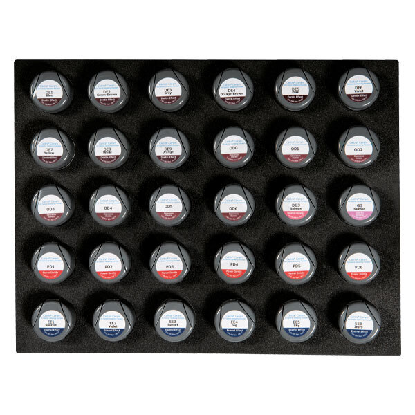 9 dentinas (DE1-DE9) de 15g. 6 powder dentinas (PD1-PD6) de 15g. 6 enamels (EE1-EE6) de 15g. 1 detina gingiva (DG3) de 15g. 1 add-on gingiva (G3) de 15g. 1 universal modelling liquid DU de 50 ml. 2 guías de colores (asthetic. gingiva).