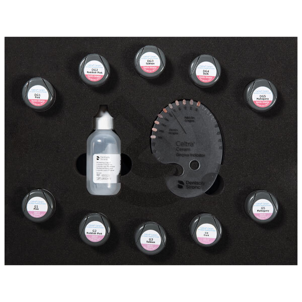 5 dentinas gingiva (DG1-DG5) de 15g. 5 add-on gingiva (G1-G5) de 15g. 1 universal modelling liquid DU de 50 ml. 1 guía de colores (gingiva).