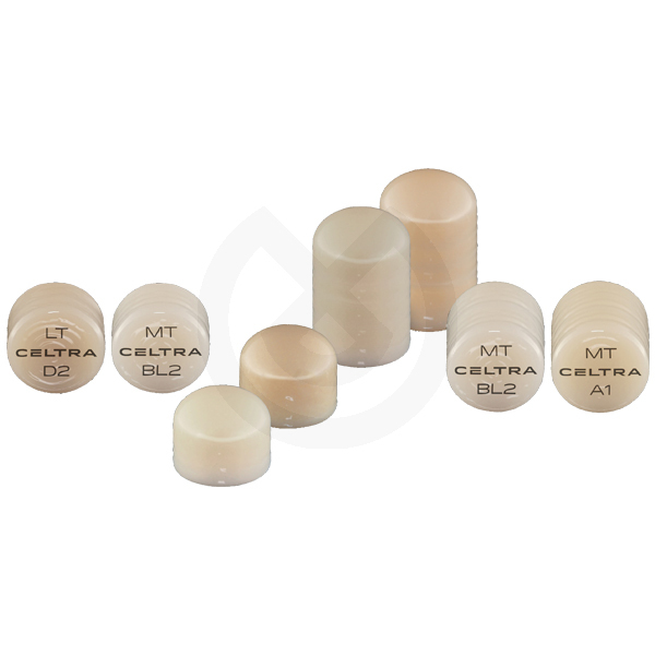 De cerámica de silicato de litio reforzada con dióxido de circonio (ZLS). Con revestimiento de esmalte cerámico de revestimiento Celtra y caracterizable cromáticamente con colores Dentsply Sirona Universal Stains.