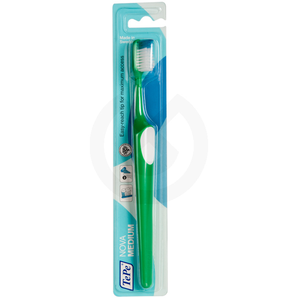 El cepillo Nova tiene un cabezal con terminación estrecha con una punta activa que facilita el acceso a zonas difíciles, especialmente alrededor de los dientes posteriores. Posee un mango resistene y antideslizante. Textura media.