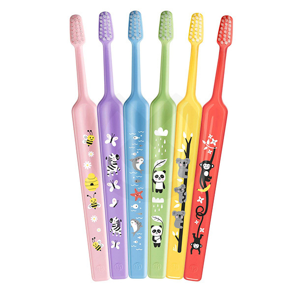Cepillo dental indicado a partir de los 6 años. Filamentos de tynex de punta redondeada. Mango ergonómico, tanto para el niño como para el adulto que le ayuda. El mango permite ser angulado una vez calentado. En siete colores surtidos, con siete diseños diferentes.