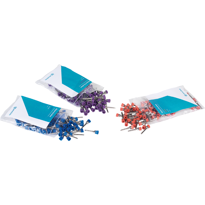 Cepillos para contra-ángulo fabricados en nylon de alta calidad con diferentes grados de dureza para adaptarse a todas las necesidades clínicas.
