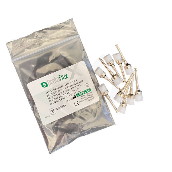 Cepillos de nylon duros en forma de mini copa para utilizar en contra ángulo y realizar la profilaxis ayudándose de una pasta adecuada. Dureza adecuada para realizar una limpieza óptima sin dañar la superficie de los dientes.