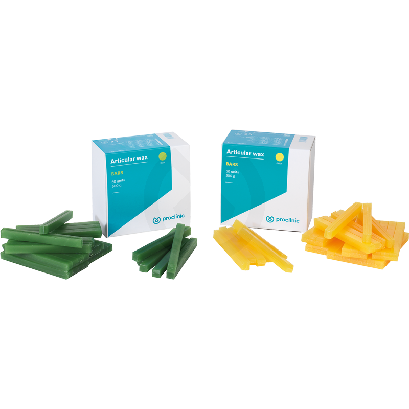 Verde. Barras de cera para mordida, articular. Amarilla. Barras de cera para mordida, articular.