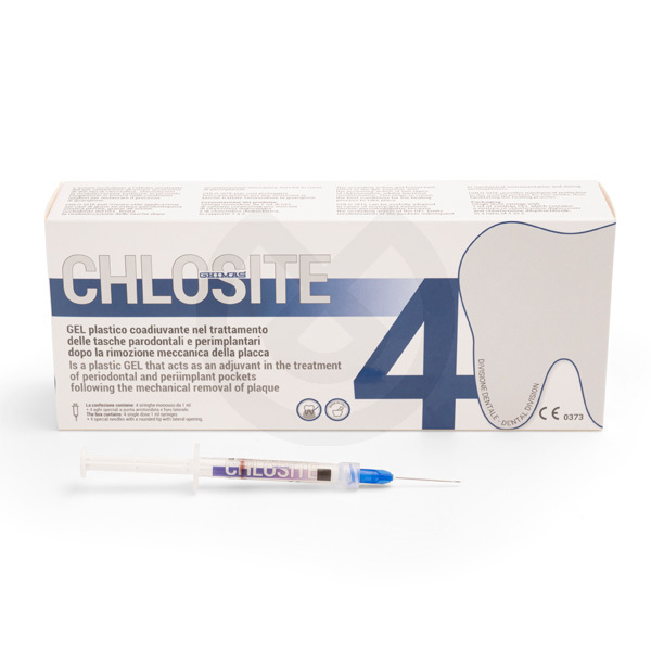 Tratamiento no quirúrgico elegido para enfermedades infecciosas periodontales y peri-implantares. Fácil, simple, eficaz y seguro. Para solucionar los problemas de eficacia ante la resistencia antibiótica de las bacterias y los riesgos de alergias, CHLO-SITE ha sido creado para el empleo parodontal y perimplantario. Se compone de clorhexidena en un nuevo tipo de gel xantano: gracias a las propiedades mucoadhesivas del xantano se estabiliza en su aplicación y se adhiere a los tejidos. Es el único gel que contiene 1,5% de clorhexidina, que puede asegurar durante al menos dos semanas óptimas condiciones de desinfección pasiva progresiva. Se aplica fácilmente a la porción mas profunda de las bolsas parodontales mediante una aguja con punta redondeada con orificio lateral que facilitará la aplicación del producto y evitará daños traumáticos en los tejidos interesados en el proceso patológico. En el sitio de aplicación es un tratamiento que actúa destruyendo e impidiendo el desarrollo de las bacterias responsables de las enfermedades periodontales y peri-implantares Se elimina espontánea y progresivamente en el sitio de aplicación en 15- 30 días y es bien tolerado.