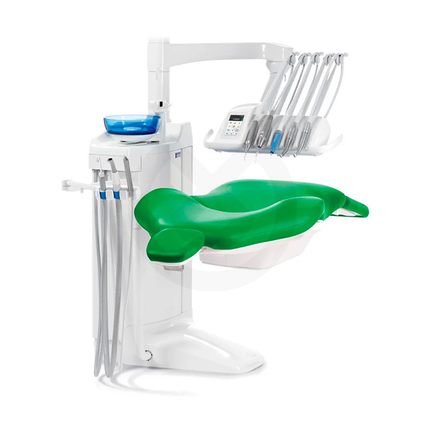 El sillón con mecanismo de ascenso lateral y la pequeña base de la salivera maximizan el espacio para las piernas, tanto para el odontólogo como para el asistente. La base queda libre para los taburetes y el equipo odontológico puede trabajar lo más cerca posible del paciente. El diseño del respaldo inclinado y curvado también contribuye a un excelente acceso a la boca del paciente.