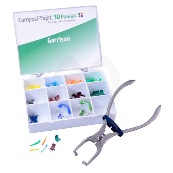 1 anillo corto azul Composi-Tight 3D Fusion + 1 anillo ancho verde Composi-Tigh 3D Fusion + 40 cuñas en 4 tamaños Composi- Tigh 3D Fusion + 40 matrices en 5 tamaños Composi-Tigh 3D Fusion + 1 fórceps para anillos