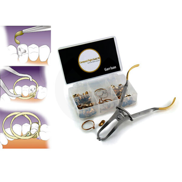 El Sistema de retenedores de Matriz Seccional Composi-Tight Gold con retenedores G-Ring patentados facilita la implementación de contactos firmes, anatómicamente correctos, para restauraciones compuestas posteriores de clase II. Todos sus componentes están hechos de acero inoxidable de alto grado y pueden ser esterilizados por cualquier técnica aceptada. El color oro claro de los componentes se debe a un proceso de alivio de la tensión secundaria que aumenta su resistencia. El sistema se compone de 4 tipos de matrices contorneadas y dos tamaños de anillos retenedores, todo ello para una aplicación sencilla y rápida.