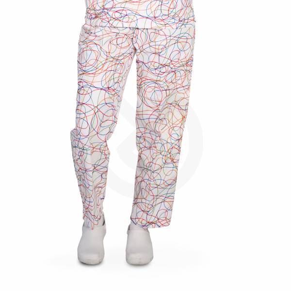 Pantalón recto de cintura con pespuntes y goma. Con bolsillos.